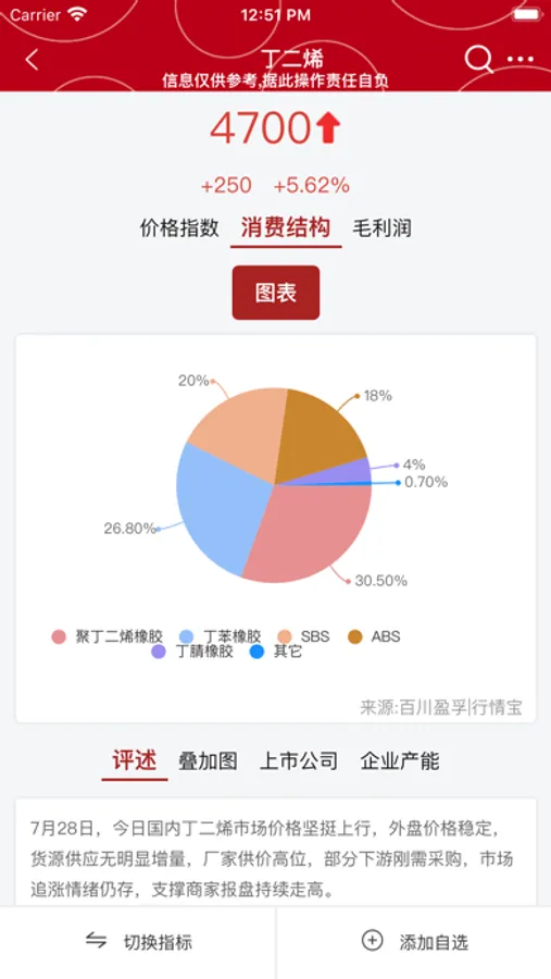 百川盈孚APP内容涵盖多个产业链的商品资讯、价格、产量、开工率、库存、成本、利润、进出口、宏观经济等数据。