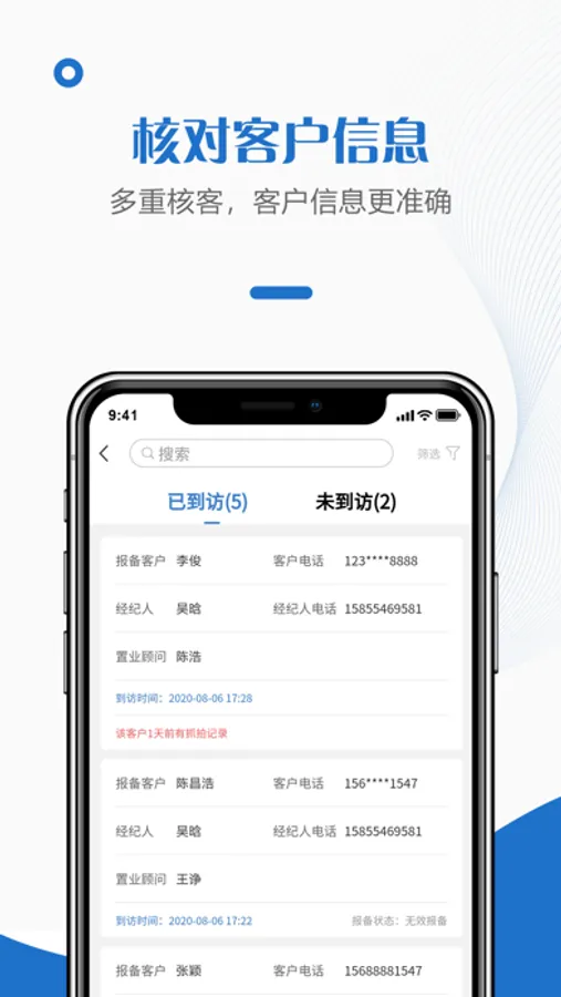 配合快销天下全民营销app一起使用,实现经纪人报备客户规范,筛查问题客户,把控风险。更好的管理房地产案场接待质量,把控飞单等风险。