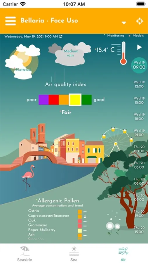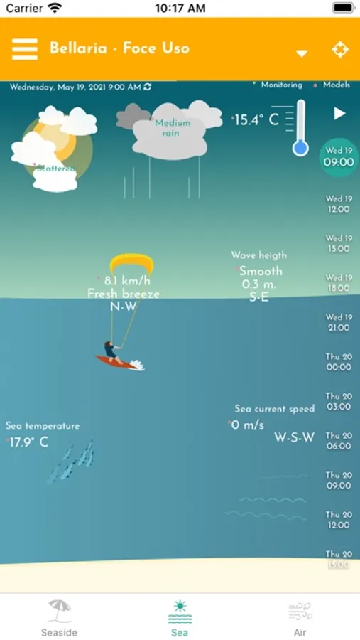 Infomare-ER is the app dedicated to seaside tourism which provides information on weather conditions and forecasts for over 120 locations on the Emilia-Romagna Riviera: weather, air and sea temperatures, humidity, precipitation, cloud cover, wind speed, wind direction, wave height, wind direction, sea currents and sea bathing.