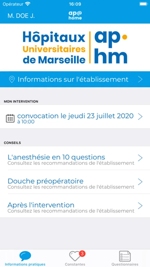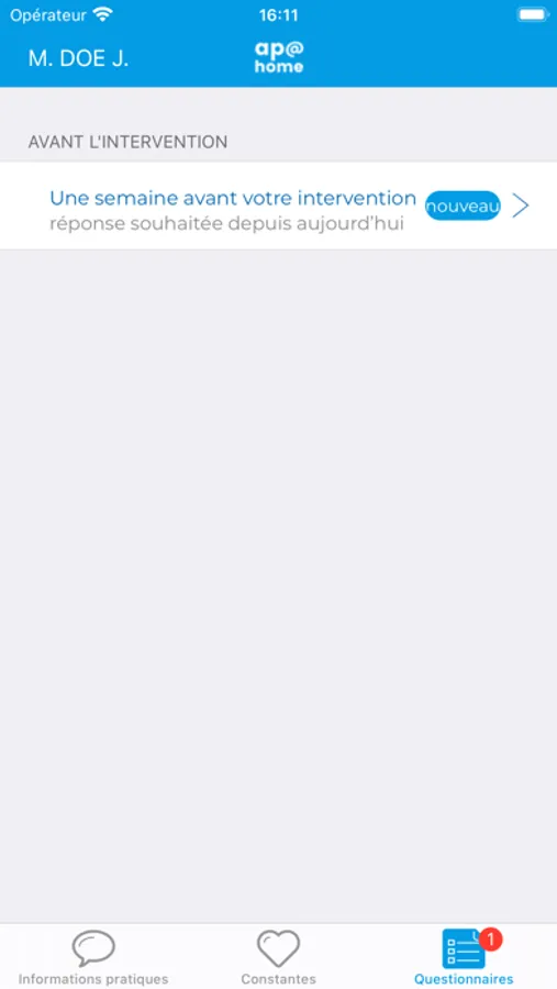 Vous pouvez ainsi mieux appréhender votre prise en charge, à votre rythme et en toute autonomie grâce aux conseils et rappels pré-opératoires ainsi qu’aux formulaires et prise de constantes post-opératoires adaptés à votre intervention.