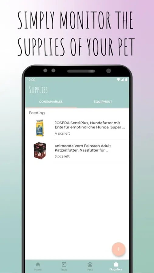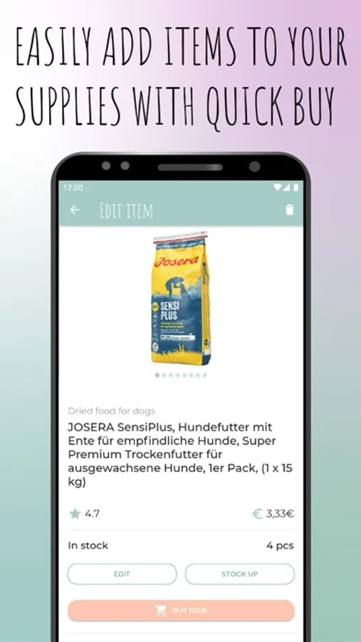 With Petory you can also cover your pet needs. Manage your inventory and storage easily in the app and use our quick purchase to order simple and trendy products for your pets.