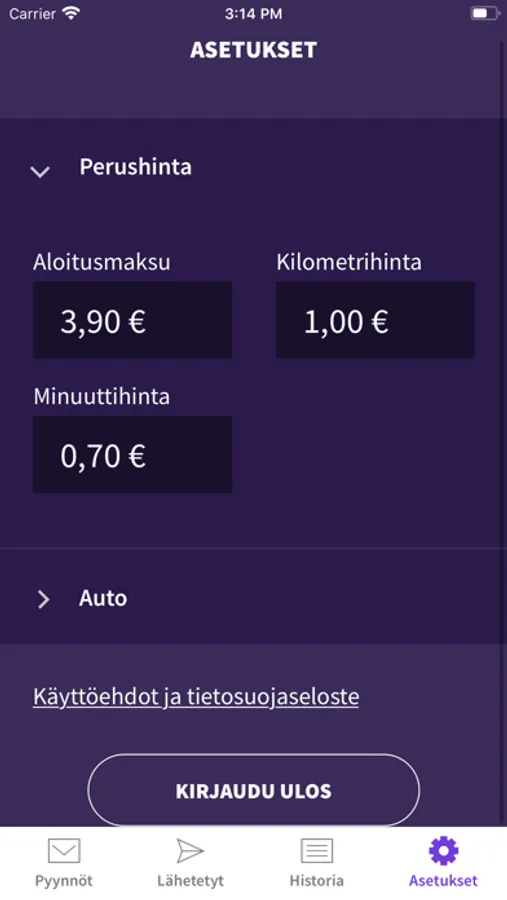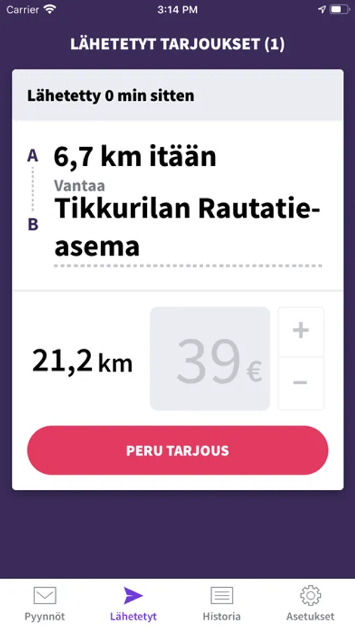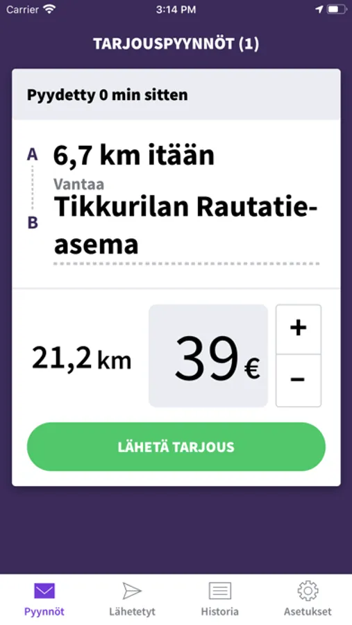 Sovellus antaa jokaiseen tarjouspyyntöön ehdotushinnan, joka perustuu aiemmin asettamaasi perustaksaan. Voit myös näppärästi muokata hintaa. Asiakas voi saada Taksaria käyttäviltä kuljettajilta useita tarjouksia, joista hän valitsee mieleisensä.