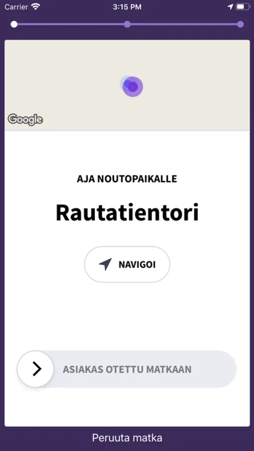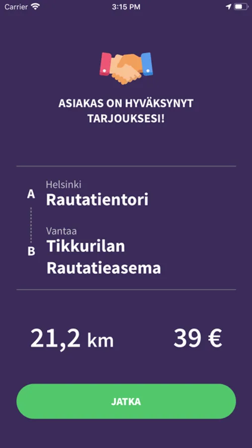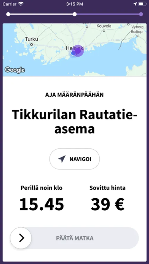 Kun asiakas on hyväksynyt tarjouksesi, Taksari ohjaa sinut noutopaikalle ja määränpäähän. Halutessasi pääset yhdellä napautuksella Google Mapsin navigaattoriin. Määränpäässä veloitat asiakasta normaaliin tapaan, sovitun hinnan mukaisesti.