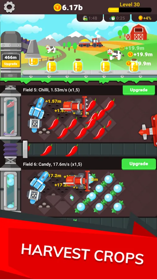 Build your empire tycoon, collect idle cash and buy fields, harvester and tractor. You can harvest many types of crops by upgrading harvester and tractor in your farm. Upgrade fields to get more crops and expand your business.