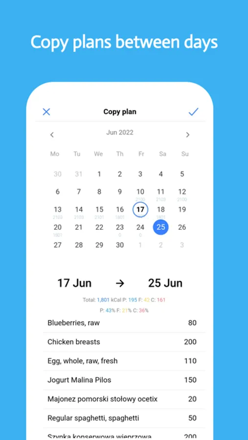 * Copy plan - Most people eat the same food from day to day. Copy-pasting will make calorie tracking even easier