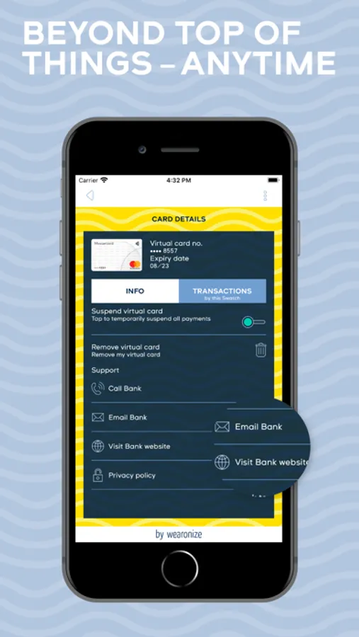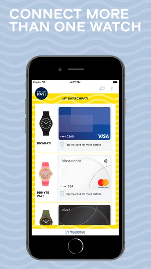 With the SwatchPAY! App by wearonize you can manage all your SwatchPAY! Watches and virtual cards.