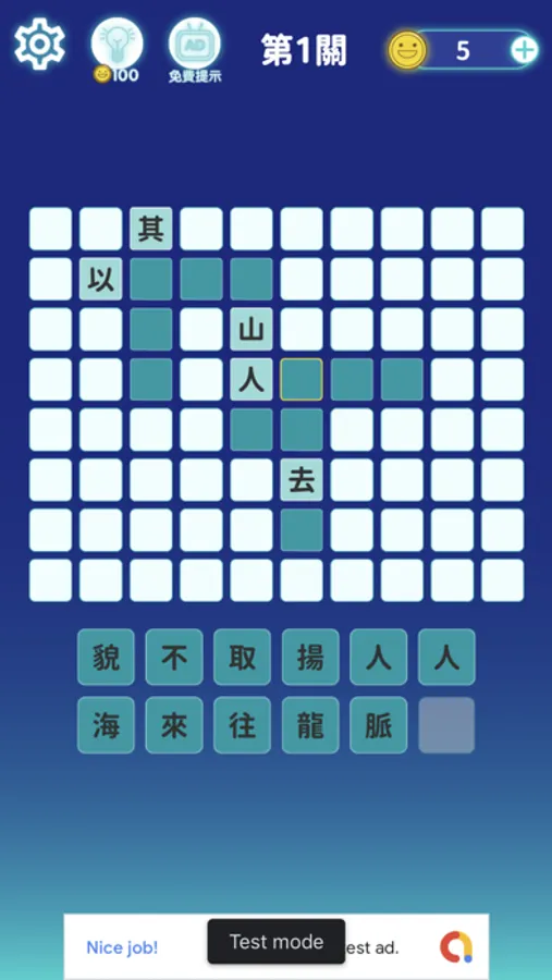 成語接龍:遊戲界面由不同的橫豎格組成。每一關共有五個成語,而每個成語均有字詞缺漏,玩家需在已知的文字提示下,將下方的字詞放上正確的空格內,以組成完整的成語。