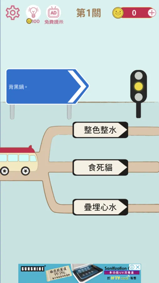 地道俗語:遊戲界面是為一交通場景。路牌上會顯示句子,而玩家需在界面上選取與句子相符的俗語,交通燈會亮起綠燈,小巴才能通過道路。
