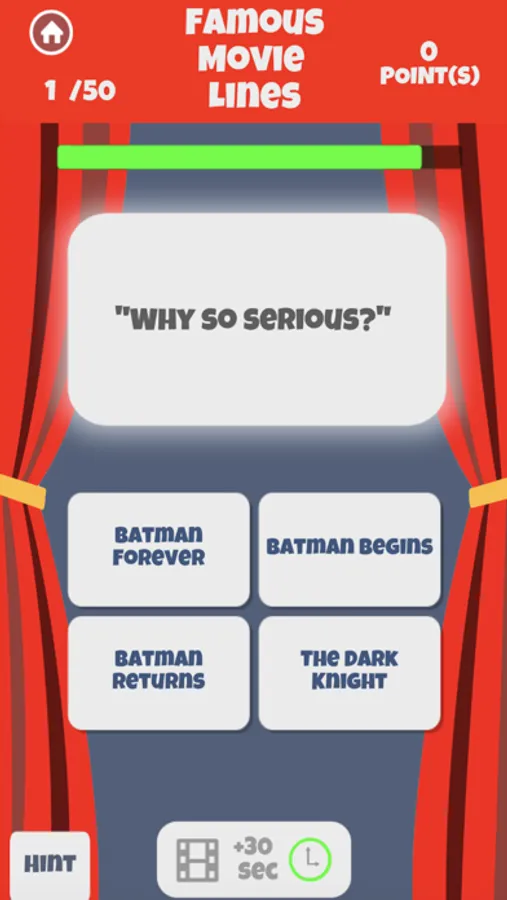 Find yourself stuck on a question or need more time to complete the round? No Problem! Includes hind and add time buttons located at the bottom of the screen