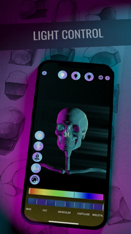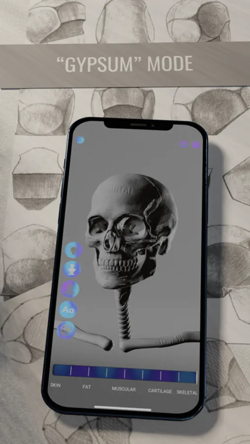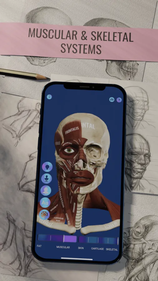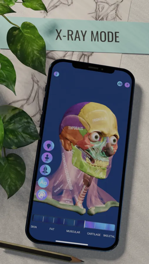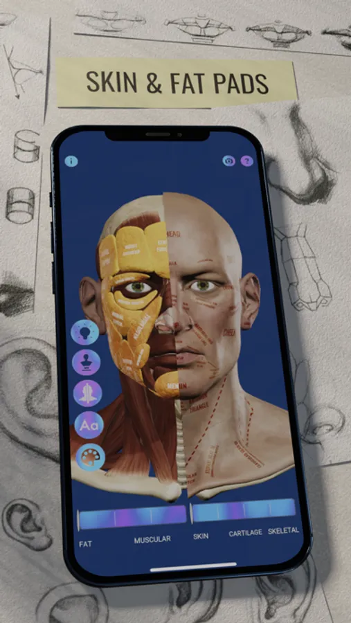 The app has an intuitive interface for easy navigation through 4 layers of facial anatomy: