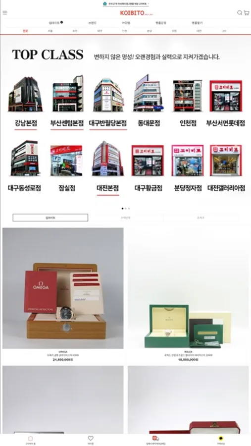고이비토 강남본점 / 부산센텀본점 / 대구반월당본점 / 동대문점 / 인천점 / 대구동성로점 / 잠실점 / 대전본점 / 대구황금점 / 부산서면롯데점 / 분당정자점 / 대전갤러리아점 / 수원광교점 등 국내최대 중고명품 매장으로 명품시계, 명품가방, 쥬얼리, 구두, 의류까지 모든 상품을 직접 보고 구매하실 수 있으며 전국 27개 중고명품매장과 직영 A/S 센터를 함께 운영하고 있습니다.