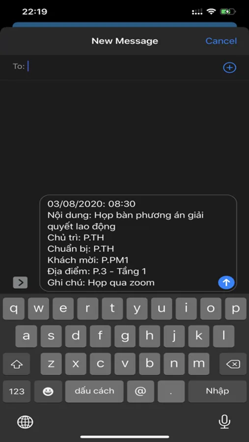• Chia sẻ thông tin họp: Tự động soạn SMS để gửi cho người khác (lãnh đạo giao cho người khác đi họp)