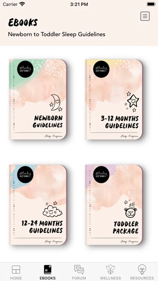 The app contains 4 detailed baby sleep eBooks that hold the answers to baby sleep, with different eBooks categorized by age.