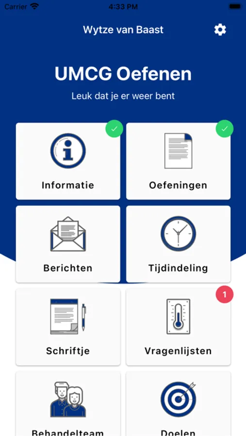 Met de Telerevalidatie UMCG app kunt u zien welke oefeningen en informatie uw behandelaar van UMCG Beatrixoord voor u heeft klaargezet. Via de app kunt u berichten, foto’s of video’s versturen naar een behandelaar.