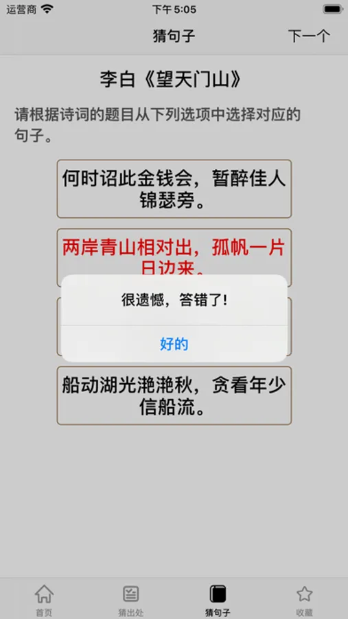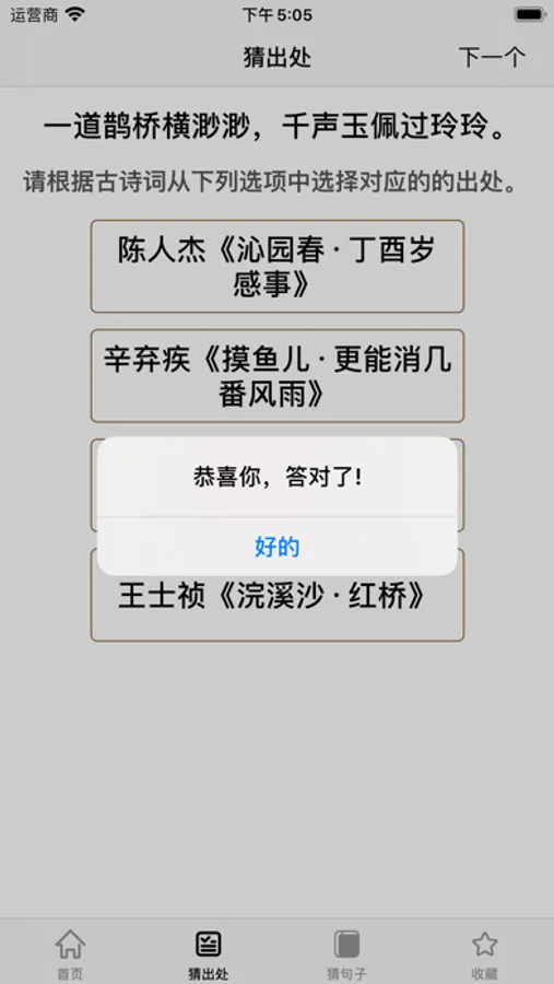 通过猜出处、猜句子的玩法,对经典的诗词句子进行记忆。