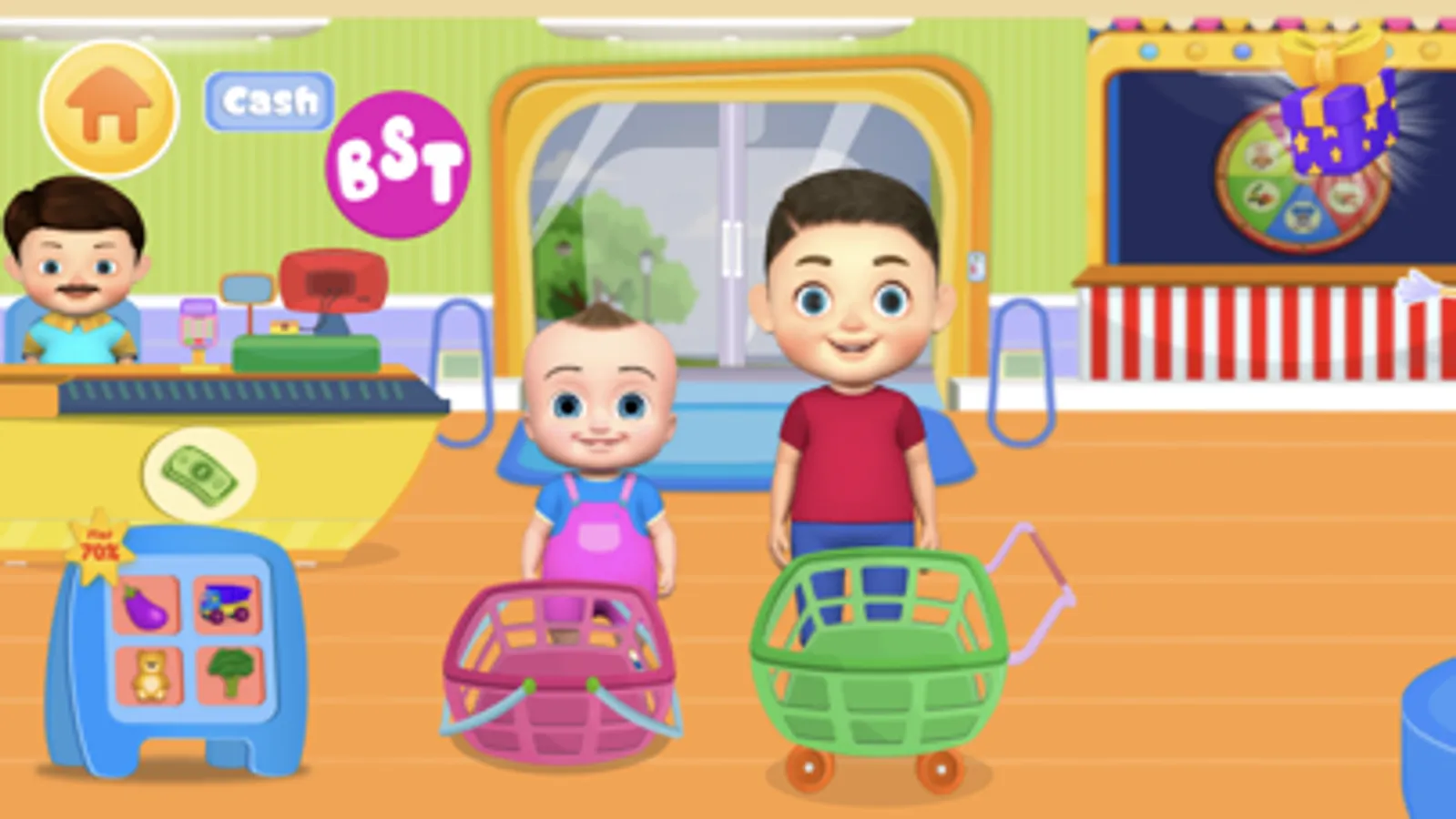 BST supermarket comes up with diverse flavors of educational elements for kids. Our cute little tots are on the way to shopping from BST supermarket. Buckle up! We’ve loaded a billion surprises for your champ! BST supermarket allows you to shop over many products that are familiar for kids: Potables, Pastries, Candies, Vegetables, Eatables, Toys, Clothes, Daily products, etc. All you need to do is pass several levels, carry out shopping and enjoy with your favorite friends.
