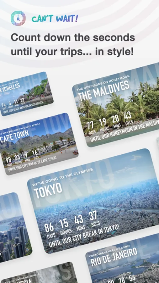 Can't wait until your next vacation? Use the CAN'T WAIT! app to create personalized countdowns, beautiful collages & Instagram stories for your trips. Count down the days, hours, minutes and seconds until your vacations! Create social media posts and stories in minutes with our story templates, collages and trendy layouts - then share your trip countdowns, count-ups and vacation memories with friends. Plan your trips with built-in travel guides and itineraries for every destination, powered by ChatGPT & Go To Travel Guides.