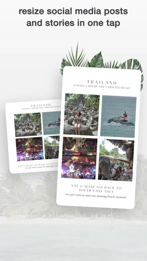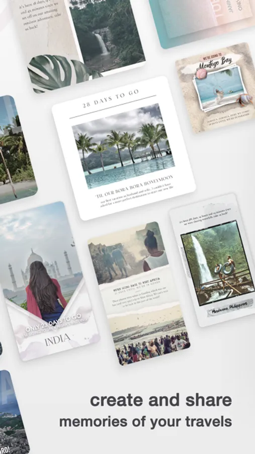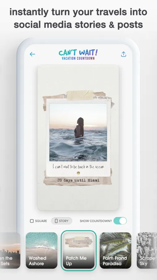 Dazzle your social media audience and let them see your trip unfold with our ready-to-use story templates and collages, which you can personalize with your own photos and text. The CAN'T WAIT! Vacation Countdown & Story Maker app has creative templates and collages that you and your social media audience will love. Our ready-to-use story templates including cool fonts and beautiful photography have already been made for you to share on Instagram, TikTok, Facebook, Twitter, Snapchat, Pinterest, WhatsApp and more.