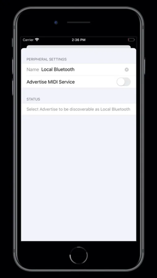 Push connect button and in the opened view turn on the switch button. This will make your device discoverable by your Bluetooth MIDI Host, connect it from it and you will can play your MIDI Host from B.M.K..
