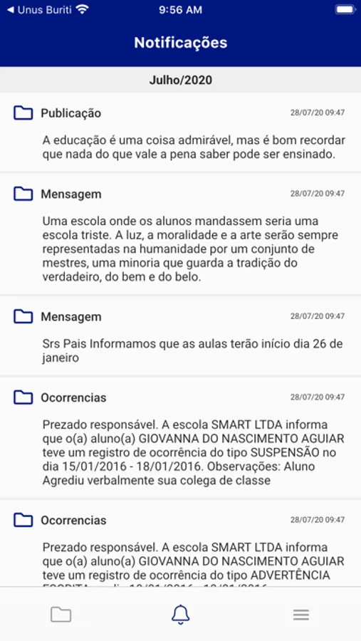 Avisos, ocorrências escolares, declaração de pagamentos, enfim....