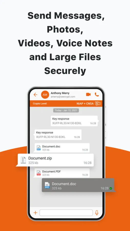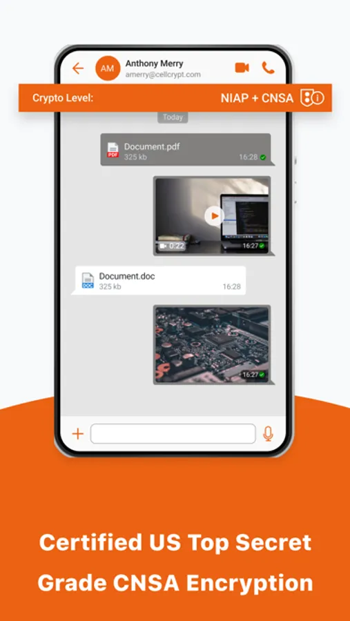 Cellcrypt Federal provides secure instant messaging with the ability to send photos, videos, voice notes, and large files of any kind. All messages and files are end-to-end encrypted with a new key generated for every message or file sent. Cellcrypt Federal's enhanced Data at Rest encryption protects all files and media stored within the app.