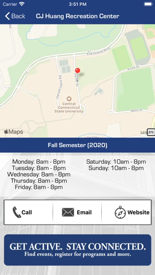 The website provides most of the information you need to get involved in one of the four disciplines at Campus Recreation. If you have questions please feel free to contact the Welcome Desk at (860) 832-3734.