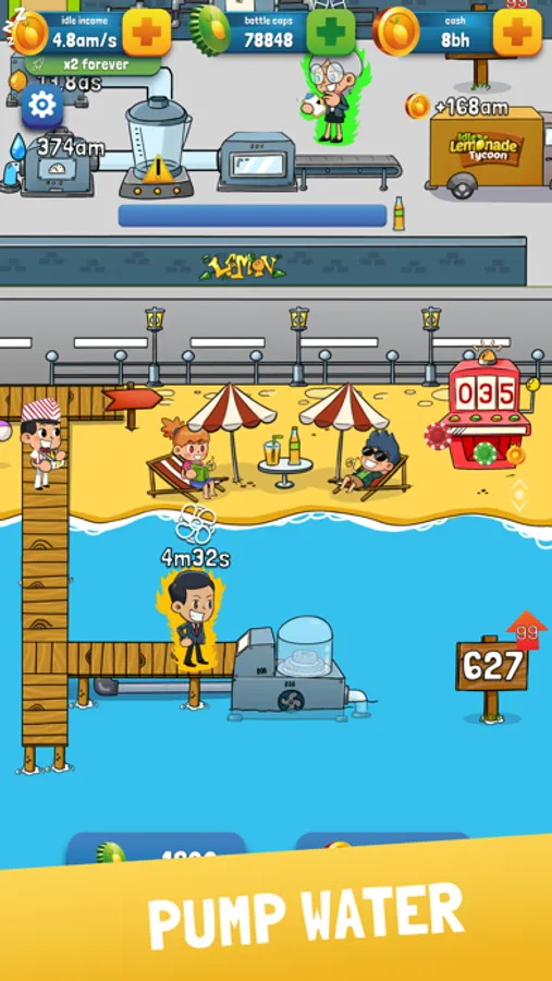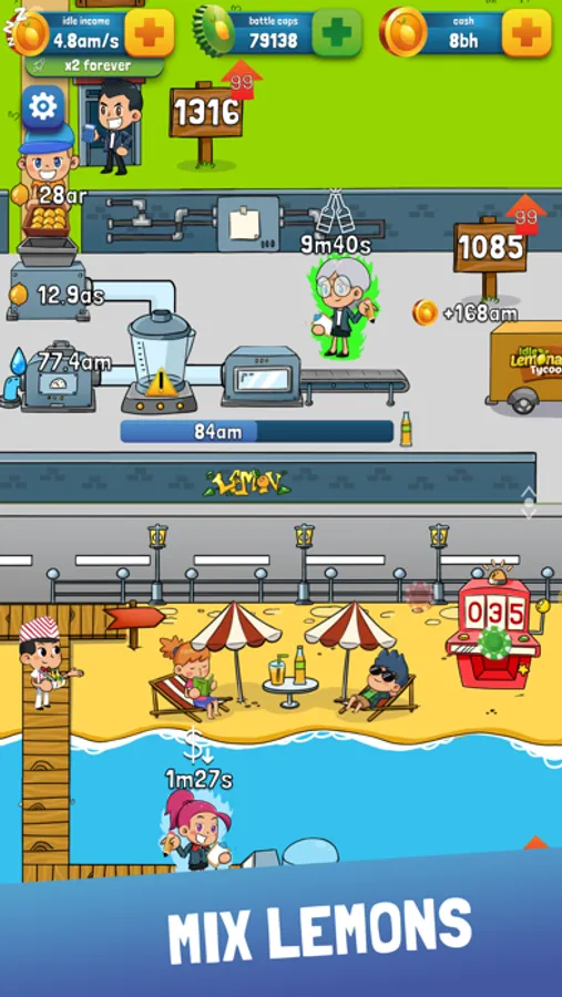 Sell lemonade drinks at the lemonade bar with your lemonade stand at the beach to increase your idle profits. You will feel like a gold miner tycoon. Click the lemonade seller for regular rewards and improve your earnings!