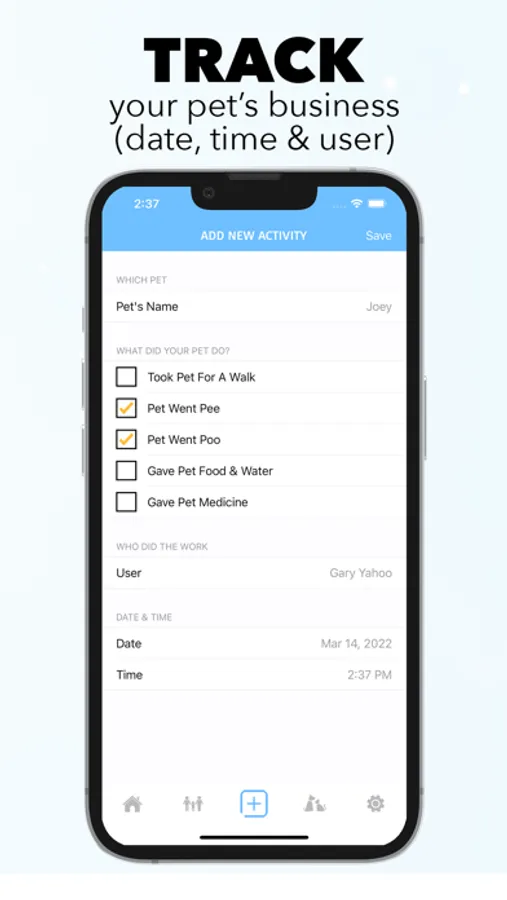 Keeping track of when your pet does his business, or when they are fed, or when they are given their medicine can be a huge headache when there are multiple people in the house that share those responsibilities. PetLoo allows you to easily keep track of who in your household is doing the work. Everyone set up with the app will receive a notification when someone posts a new activity!