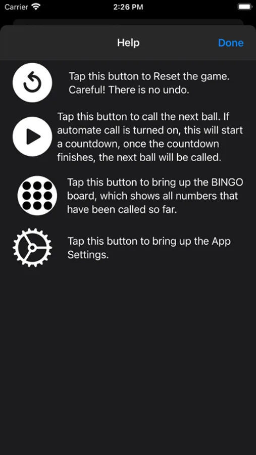 Connect your iOS device to an external monitor or an AirPlay compatible device (such as an AppleTV) and you will see a big BINGO Board for large display, such as to a room of players.