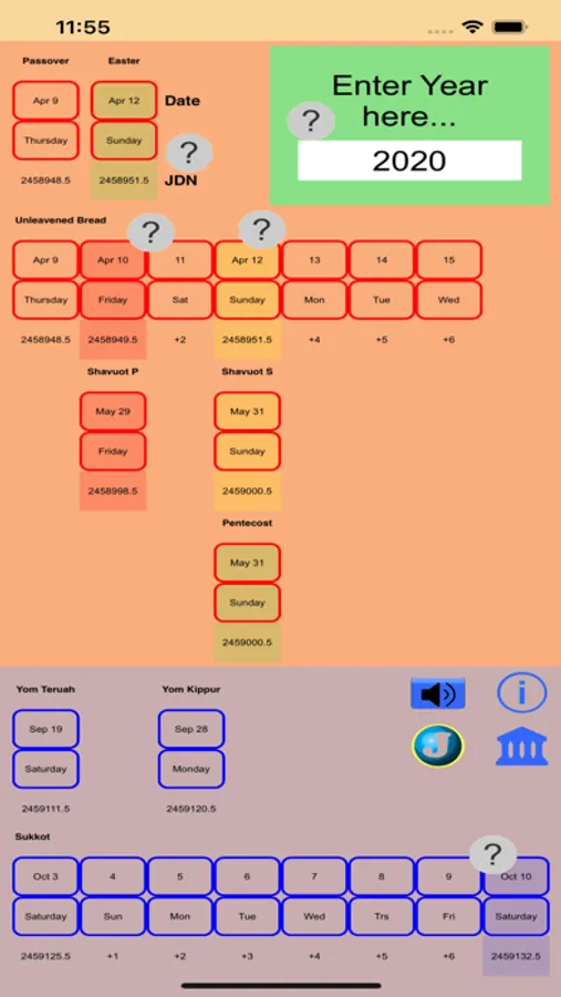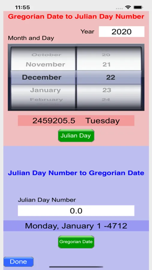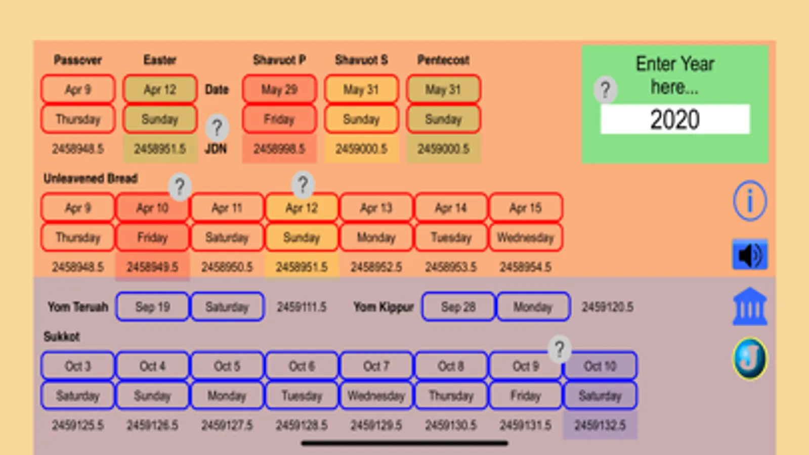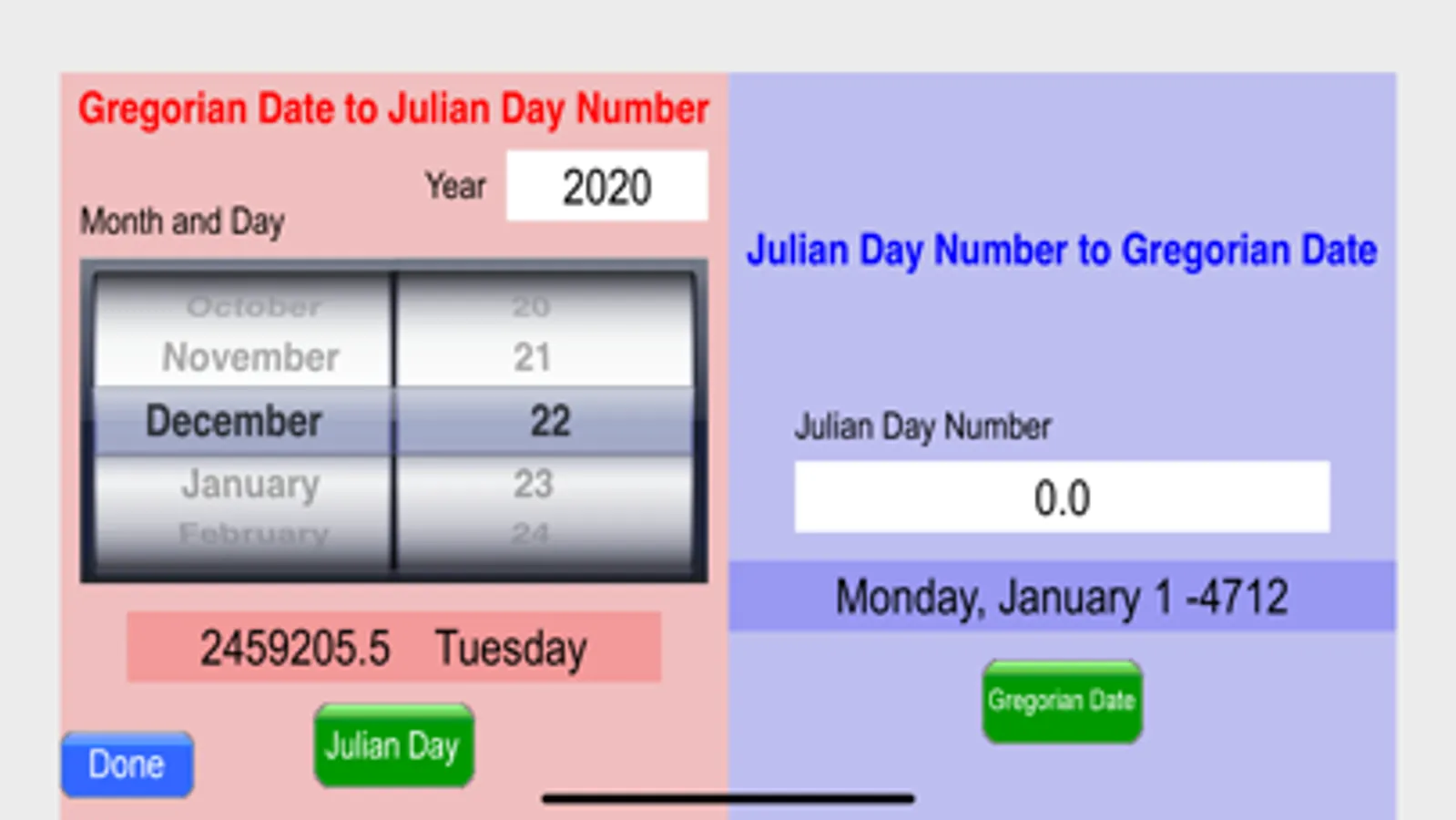 Julian Day Numbers are used by astronomers to keep track of dates or perform date-related computations. HolyDates provides a separate screen for converting between the two systems. You can: