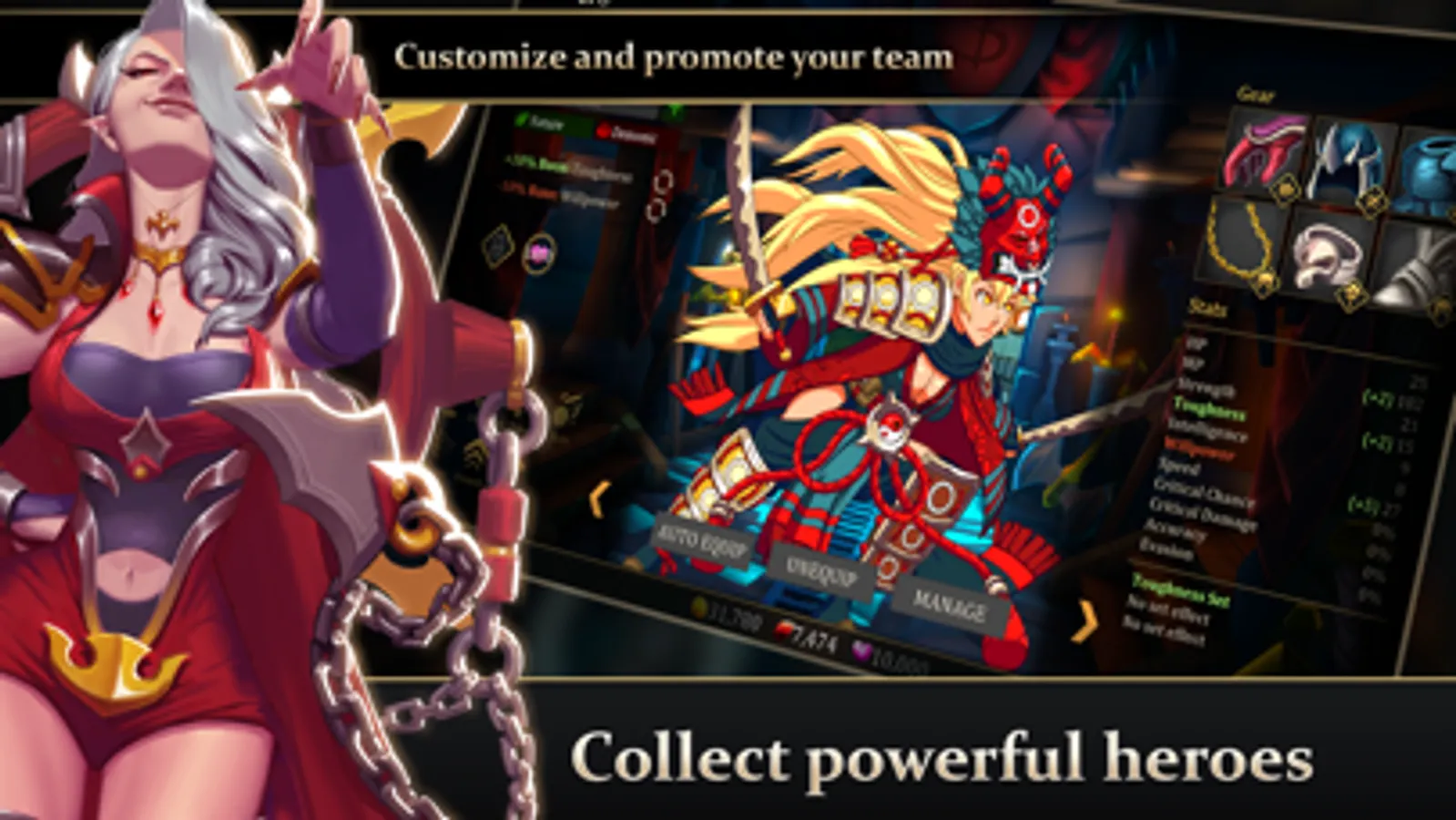Using the rarest materials collected from your enemies, upgrade your town to unlock the ability to craft legendary gear, and equip your heroes to mold them into the perfect team for executing your battle plans.