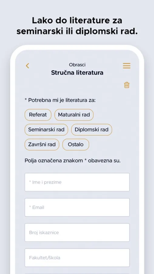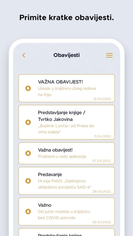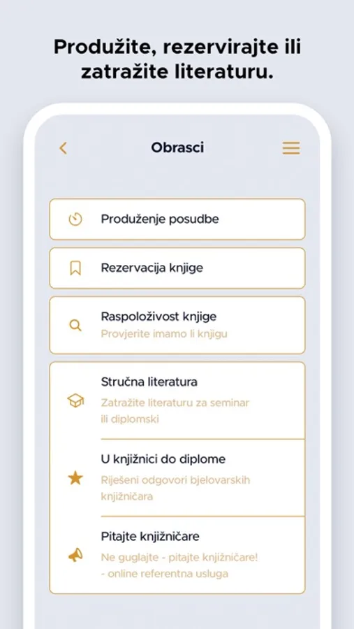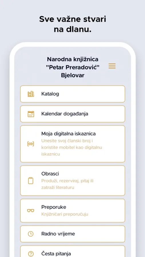 Aplikacija je namijenjena korisnicima Narodne knjižnice "Petar Preradović" Bjelovar pomoću koje korisnici mogu pretražiti e-katalog knjižnice, pregledati kalendar događanja u knjižnici, generirati svoj korisnički broj u barkod, produžiti posudbu građe, rezervirati građu ili zatražiti literaturu za stručnr radove. Unutar aplikacije nalazi se Radno vrijeme knjižnice, odgovori na Česta pitanja, kontakt podaci svih odjela i službi knjižnice te poveznice na društvene mreže.