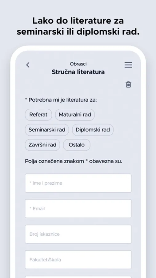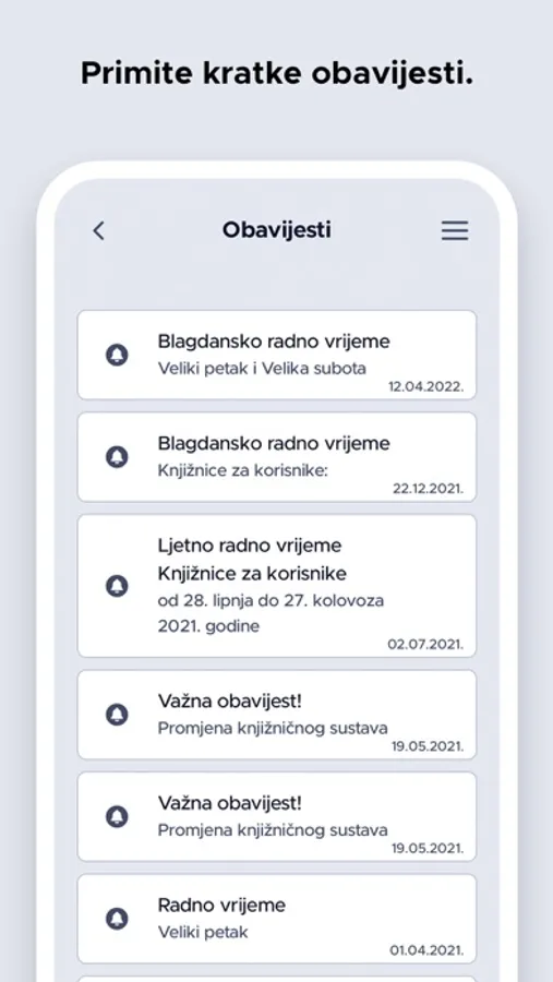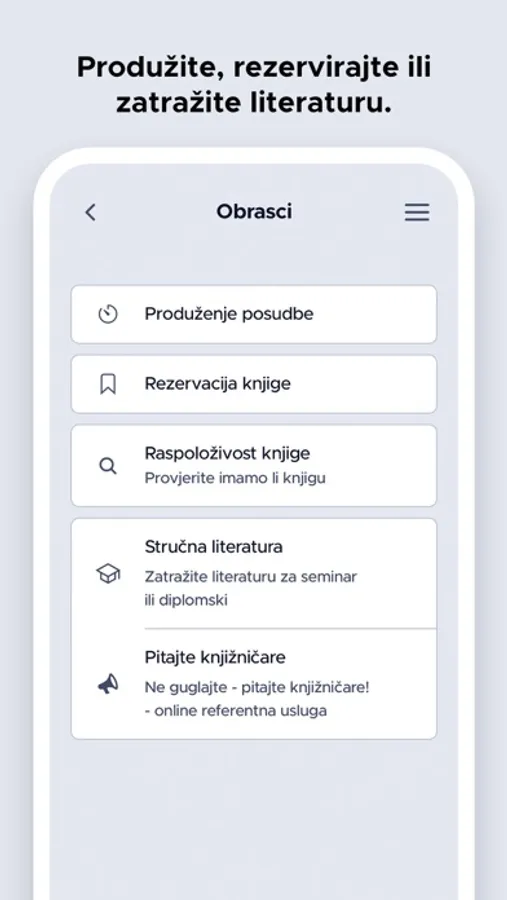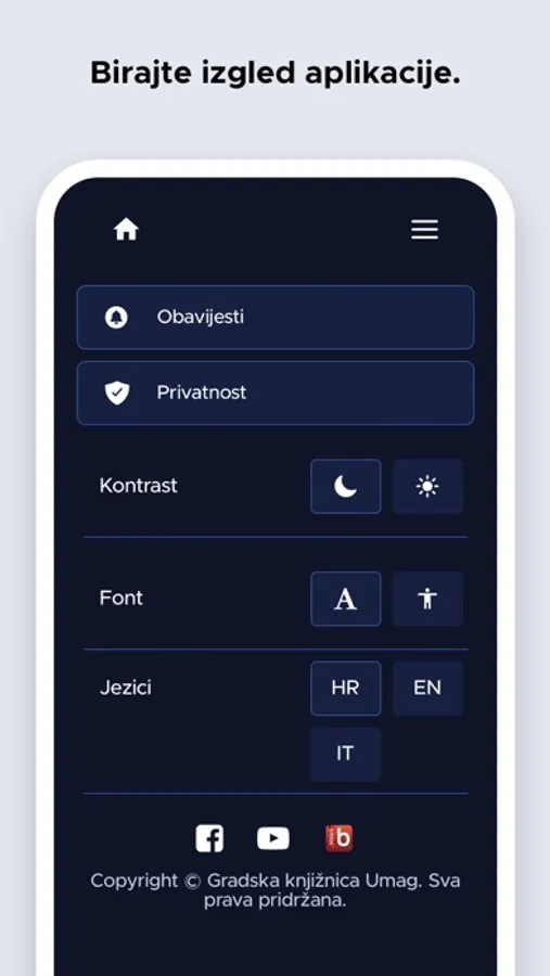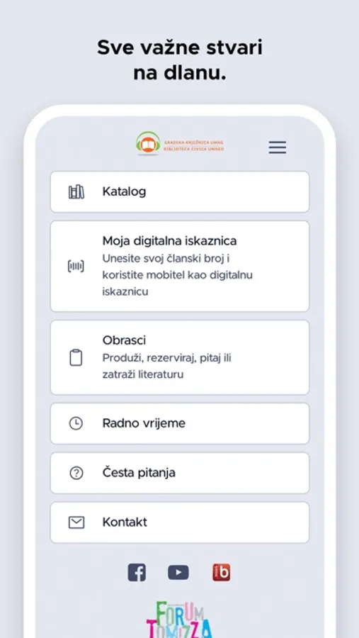 Aplikacija je namijenjena korisnicima Gradske knjižnice Umag. Korisnici mogu pretražiti e-katalog knjižnice, pregledati kalendar događanja u knjižnici, generirati svoj korisnički broj u barkod, produžiti posudbu građe, rezervirati građu, provjeriti ima li knjižnica primjerak neke građe ili zatražiti literaturu za seminarski rad. Unutar aplikacije nalaze se i radno vrijeme knjižnice, odgovori na česta pitanja, kontakt podaci te poveznice na društvene mreže.