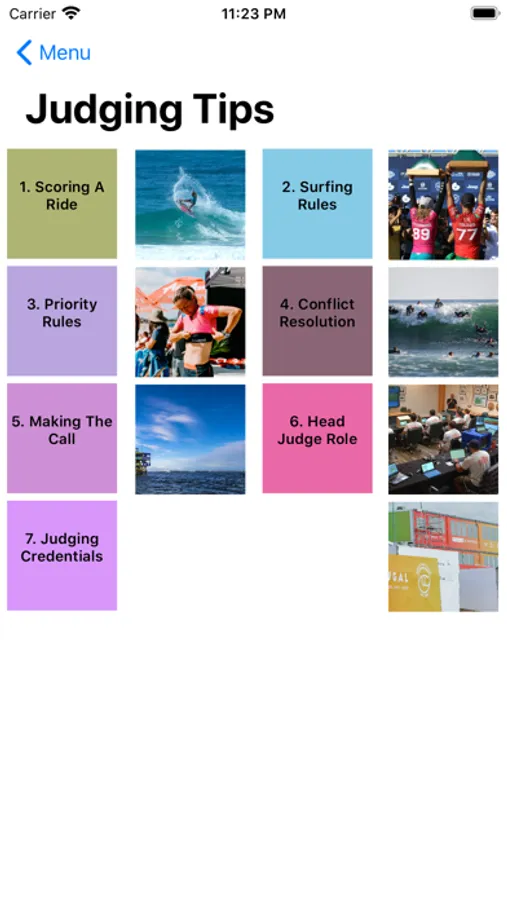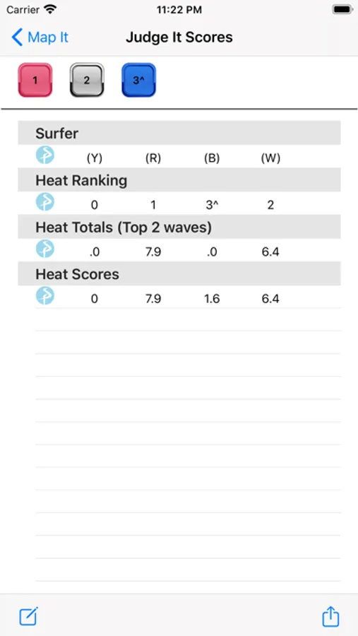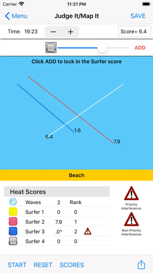 - Judge It Score: Similar to the other Judging Option but only keeps track of scores. Tap each surfer's colour and give a score to each wave. Priority and Non Priority interferences can be given and calculates the top 2 waves based on the results. Check the results page and share with the Head Judge OR store in notes section.