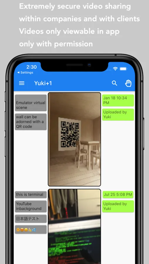 Videos can only be sent and seen within the app. It's not possible to access the videos even when the video data URL's are sniffed by hackers. Products in development and private information can remain safe.