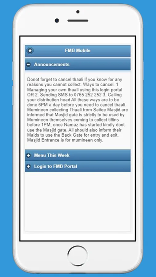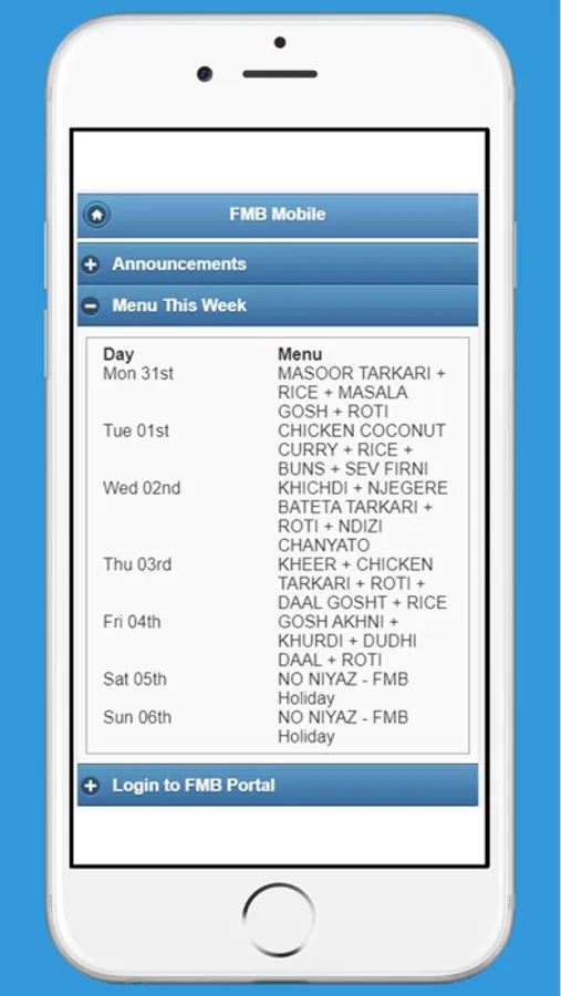 This app is used for navigating through weekly menus and announcements for Faizul Mawaid Burhaniya Dar es salaam.