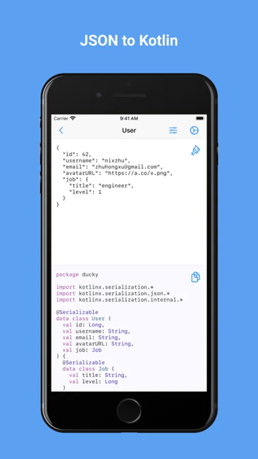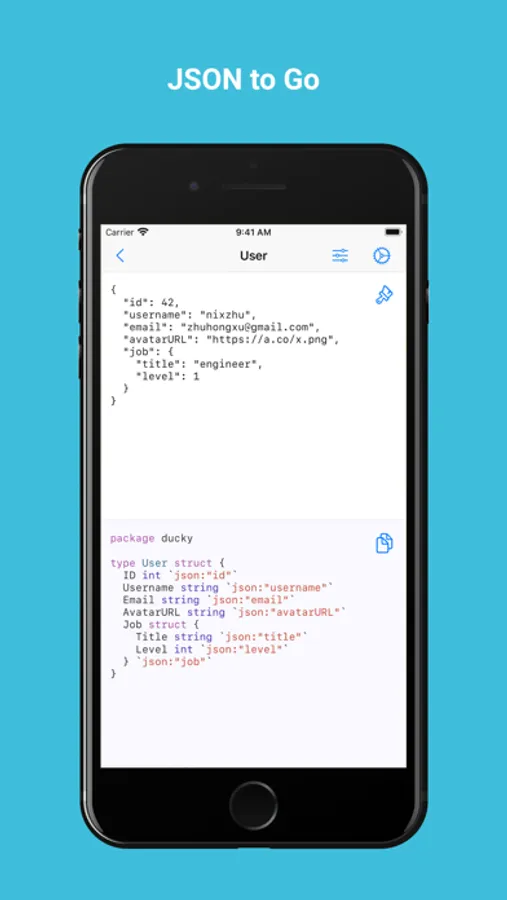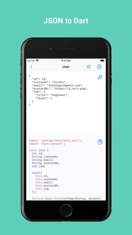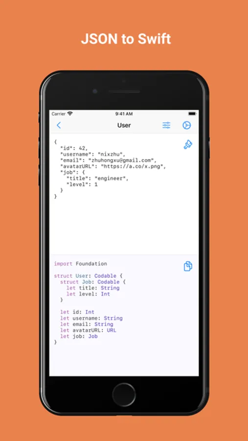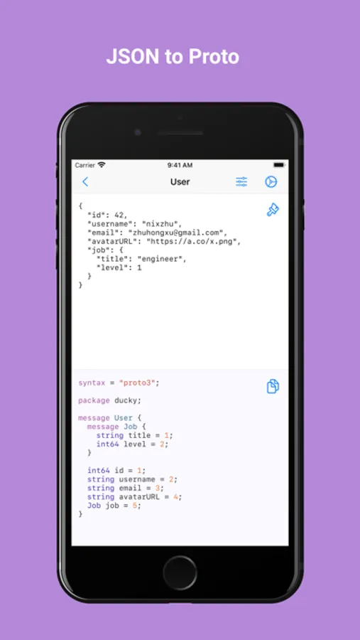 - It can infer JSON Schema, Swift (Codable or AnandaModel), Kotlin, Dart (Null Safety), Go or Proto models.