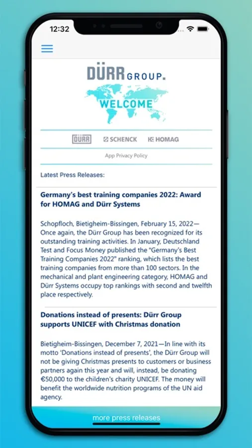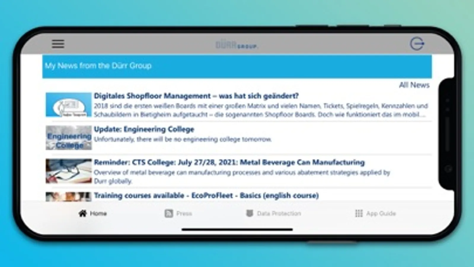 The DÜRRnet app offers interested parties and stakeholders easy access to a wide variety of corporate news from the Dürr Group: Besides the recent press releases, the financial calendar provides information about the publication of the latest business figures. In addition, the most important key performance indicators can be accessed at any time. The integrated online magazine Dürr & More offers a wide range of topics from all divisions of the Group. Furthermore, interested parties and stakeholders can subscribe to regular newsletters to receive various information on the company and its products and can order company publications such as the annual report or the ECO Group magazine. The integrated job offers allow candidates to submit their applications directly via the app.