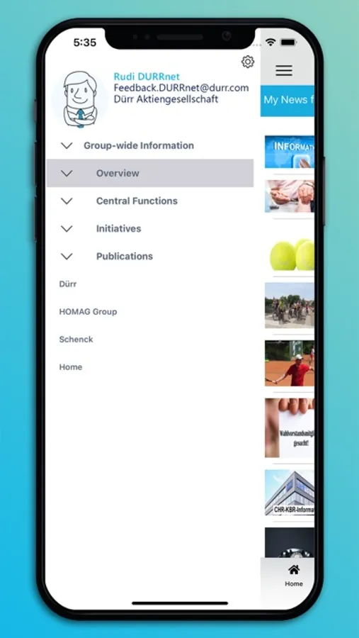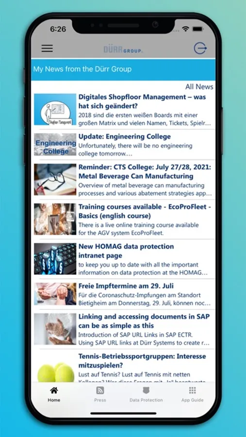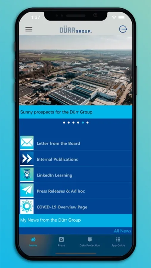 After successfully logging in, employees can access the news channel of the Dürr intranet and keep up to date with letters from the Board of Management as well as information from important areas, for example HR as well as Health & Safety. Particularly important news can be received via push notification.