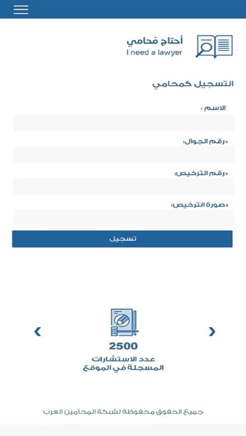 Since the need of a citizen for lawyers became urgent and the citizen service has become more accessible and easy with the digital technology revolution; Whereas the mission of the Arab Lawyers Network is to facilitate access to legal information from all its sources, including lawyers; For these reasons, the application (I need a lawyer) was launched to serve citizens in the Arab Nation.