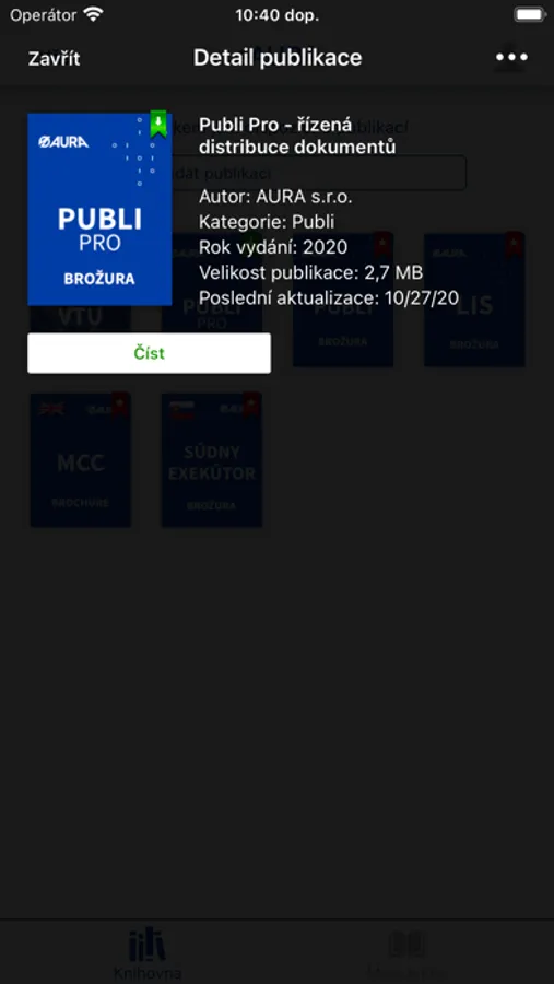 eKnihovna společnosti AURA, s.r.o., která zpřístupňuje dokumenty, publikace, newslettery, e-booky a jiné soubory zaměstnancům, zákazníkům a partnerům. Aplikace je součástí systému PubliPro pro řízenou distribucí dokumentů.