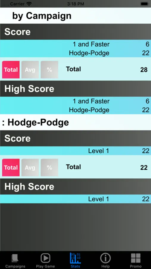 * Keeps track of statistics Total/Average/Highest for games Score across the campaigns and across the Levels within a campaign