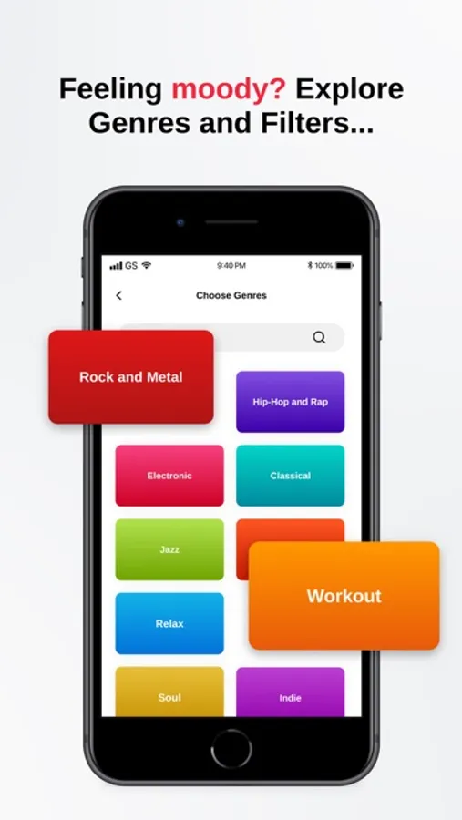 Great variety of genres and filters such as Rap, Pop, Rock and Happy, Sad, Chill