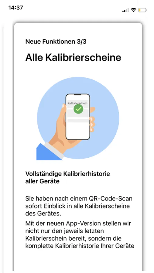 Mit Hilfe unserer App können Sie diese QR-Codes scannen, um alle relevanten Informationen zu den jeweiligen Geräten und Ihrer jeweils letzten Kalibrierung abzurufen. Sie erhalten alle Informationen direkt auf Ihr Smartphone - inklusive dem aktuellen Kalibrierschein des Gerätes.