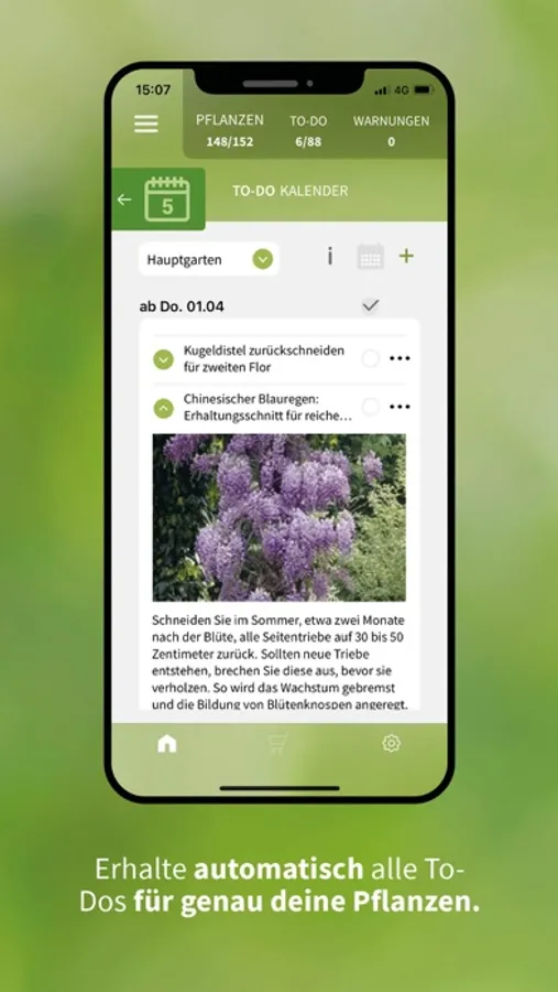 Personalisierter Pflegekalender: Behalte den Überblick über deine Gartenaufgaben mit einem praktischen Kalender. Erhalte Erinnerungen für das Gießen, Düngen, Umtopfen und professionelle Pflegemaßnahmen für genau deine Pflanzen. Inklusive fachlich fundierter Anleitungen.