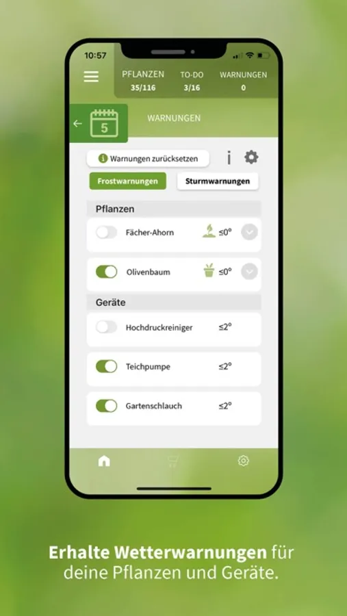Wettervorhersage: Erhalte personalisierte Wetterinformationen für deinen Standort, einschließlich Temperatur, Niederschlagswahrscheinlichkeit, Sonnenstunden und standortbezogenen Frostwarnungen. Optimiere deine Gartenarbeit basierend auf den aktuellen Wetterbedingungen.