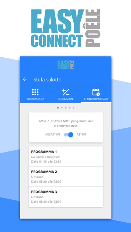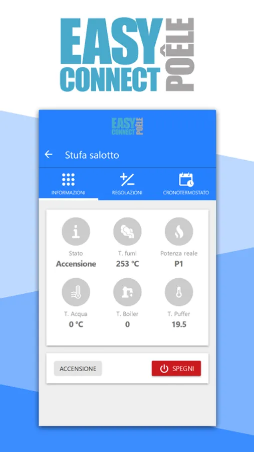 App simple et conviviale, facile à installer et donnant accès aux caractéristiques standard avec pour seul support une connexion Wi-Fi. Avec « Easy Connect Poêle », vous pouvez : allumer et éteindre le poêle, régler le thermostat programmable, vérifier l’état de fonctionnement en temps réel, régler la température du thermostat d’ambiance et les caractéristiques d’autres accessoires.