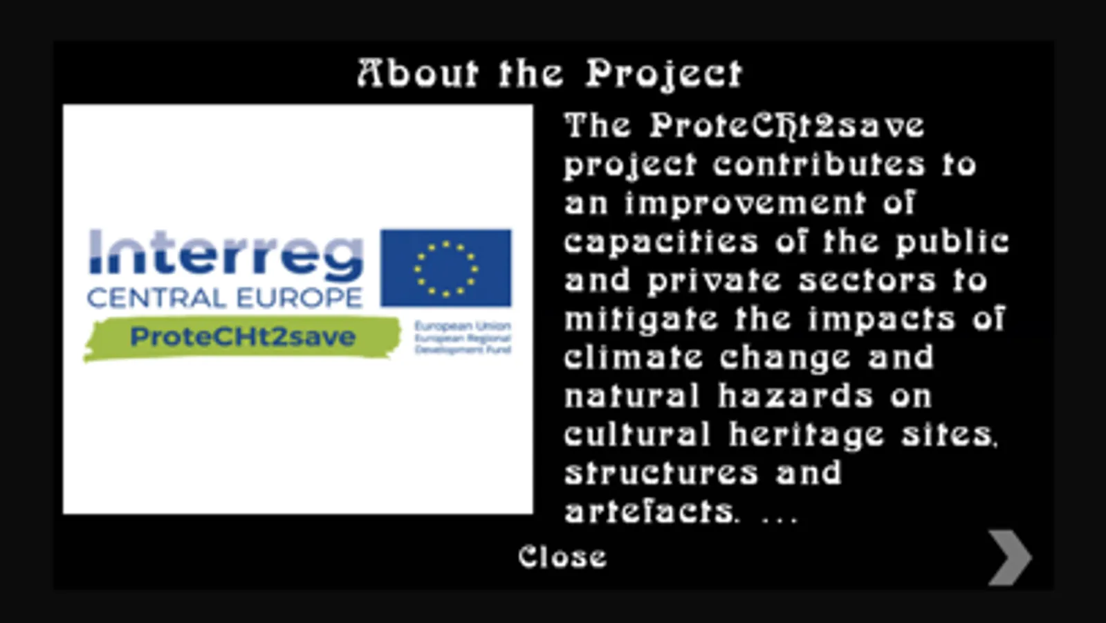 This game represents many of the deliverables, products, and lessons learned over the course of the 24-month ProteCHt2save project sponsored by EU Interreg Central Europe. They are blended into the game play so that the player can learn more about what (s)he can do to safeguard cultural heritage in their own town, region, or nation… BEFORE a crisis occurs.