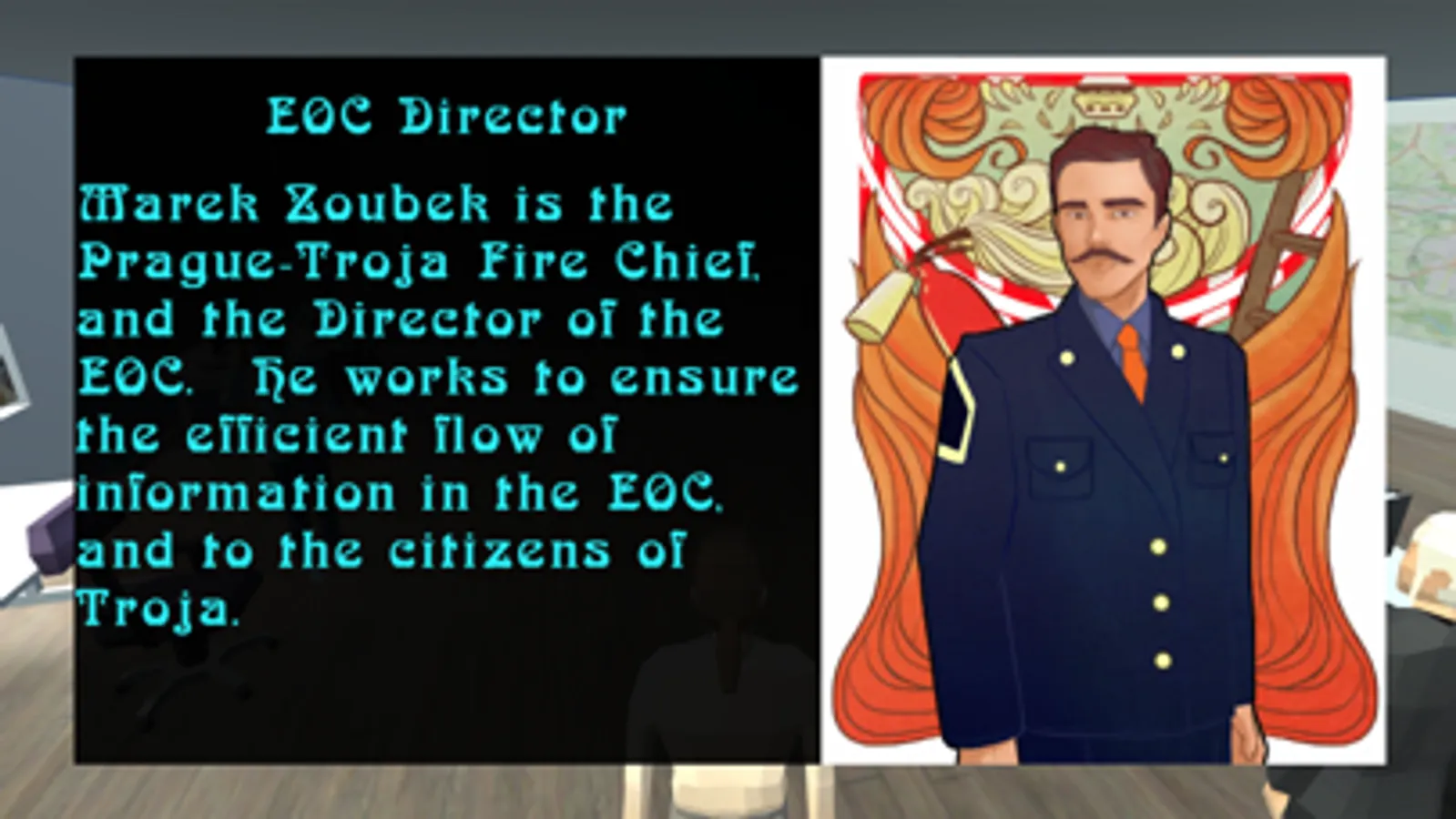 As part of EU Interreg Central Europe’s ProteCHt2save project, CHRT: Vltava Rising puts the player in charge of a Cultural Heritage Rescue Team (CHRT) brought to Prague-Troja, Czechia three days before a major flooding event is due to hit the city. The player first learns about an Emergency Operations Center (EOC), and what is required for a CHRT to operate. After receiving authorization to operate from the EOC, the team then enters Béla Palace and completes a series of tasks that are critical in the proper safeguarding and evacuation of cultural heritage objects.