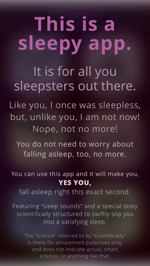 This app has everything you could ever need to ever fall asleep, AND THEN SOME. It includes 6 different sounds of applause. There is also the story of how the guy who is just the person who paid to have this app made, Sam, came up with the idea to create the app. I just programmed it for Sam. He provided all the great content for the app, which is really great. We're all really proud of Sam.